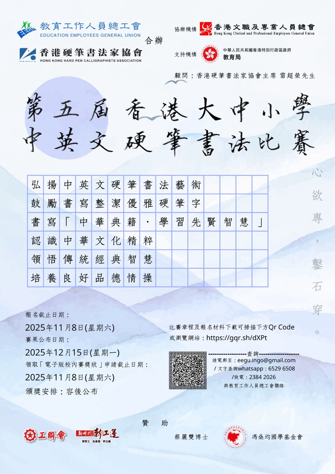 比賽截止:2025年11月8日(星期六),必須在比賽截止日期或之前,將報名表、已完成的書寫紙(參賽作品)、報名費(或入數證明)送交大會參賽(所有參加賽作品,遞交大會後不可更換),逾期恕不受理。各組參賽作品均交大會評判團評審,甄選出獲獎作品。