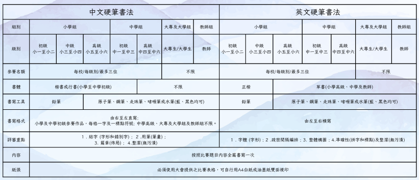 - 如學校不舉辦校內賽,可推薦中/英文書法每級最多三位學生(見參賽資格表)參賽。